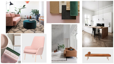 Ensimmäisessä vaiheessa saat nähtäväksesi moodboardmaisesti toteutetun sisustuskonseptin. Välivaiheessa saat kaikki valitut materiaalit ja elementit nähtäväksesi.